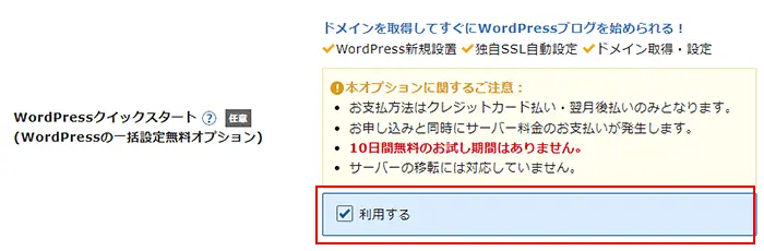 - 進めていき、「WordPressクイックスタート」の利用するにチェックを入れます。