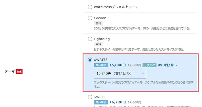 - 必要な情報を入力後、テーマの「Xwrite」を選択してください。Xwriteは「買い切り・月額・年額」のプランから選択できます。
