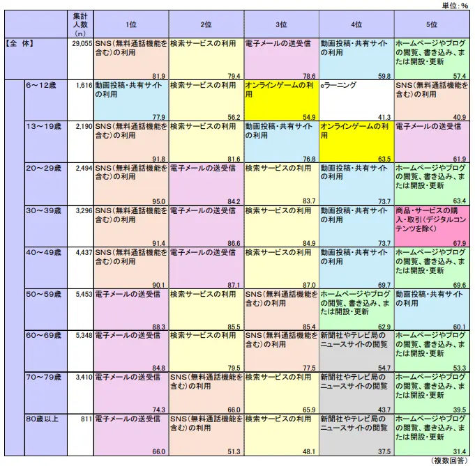 【総務省の通信利用動向調査:年齢階層別インターネットの利用目的・用途(複数回答)(令和6年)】
