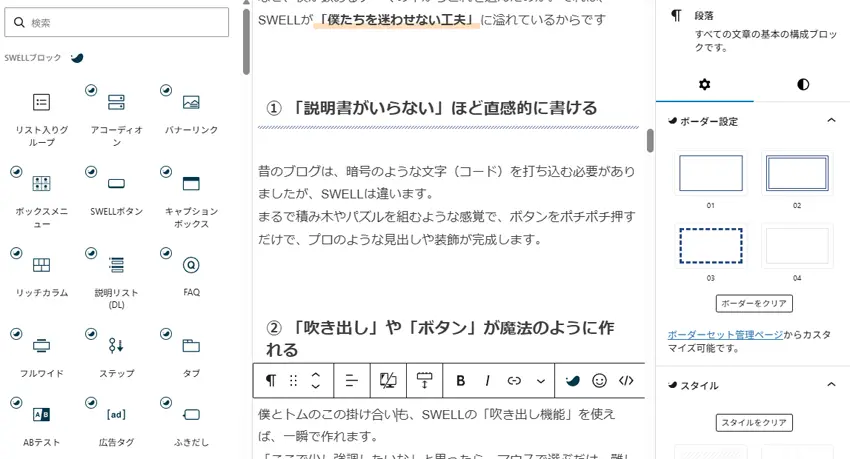 ちょうど今書いてる作業部分をスクショしてみました。真ん中の作業スペースに、左面のSWELLブロックを駆使しながら記事を書いていきます。右側は、詳細が設定できるようになっていますよ!
